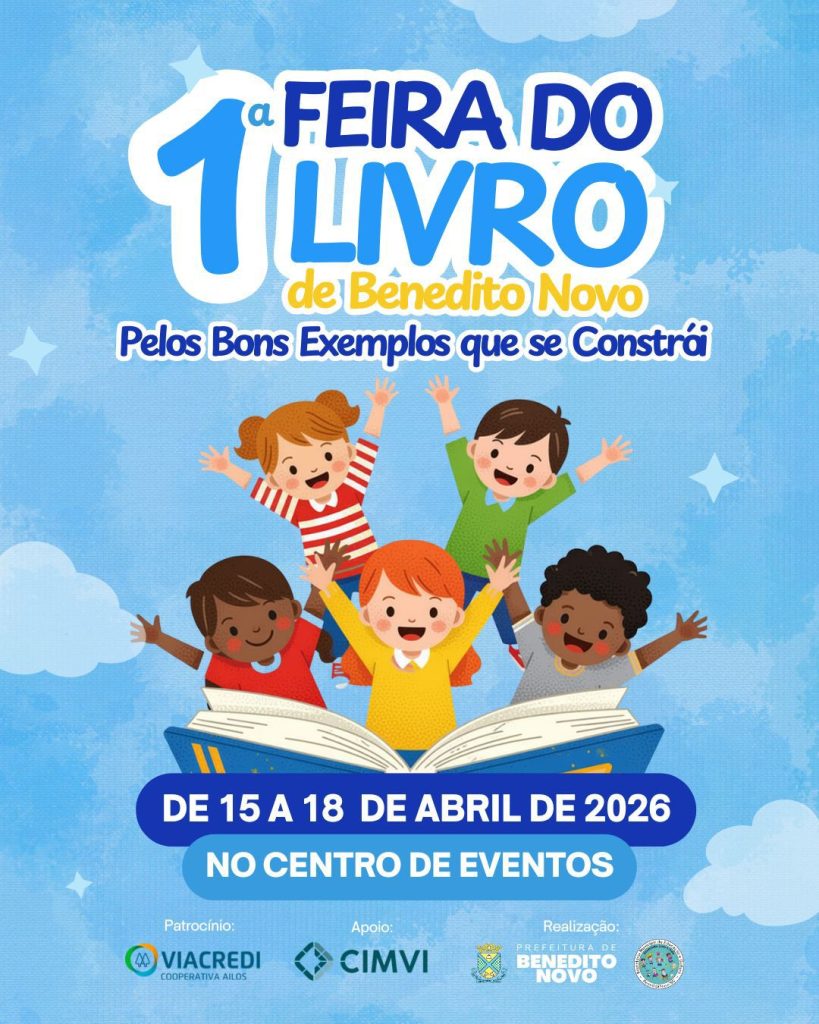 A Prefeitura de Benedito Novo, por meio da Secretaria Municipal de Educação e Cultura, promove entre os dias 15 e 18 de abril de 2026 a 1ª Feira do Livro do município. O evento será realizado no Centro de Eventos e tem como proposta fortalecer a cultura local e incentivar o hábito da leitura entre a população.