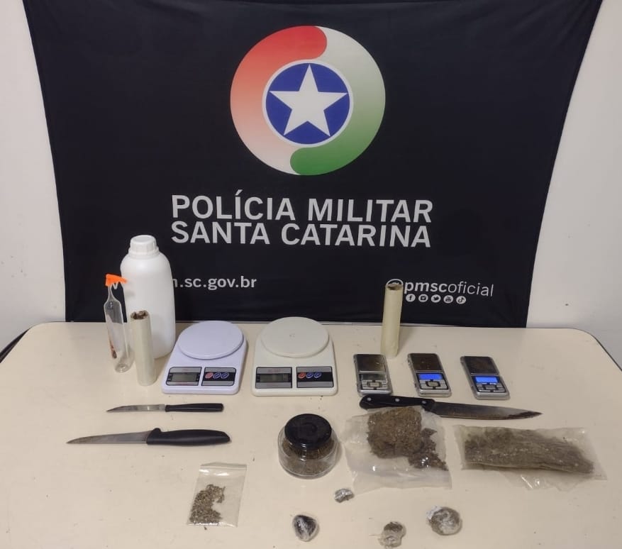 A Polícia Militar prendeu dois homens, de 24 e 26 anos, por tráfico de drogas na Rua Arthur Weise, no